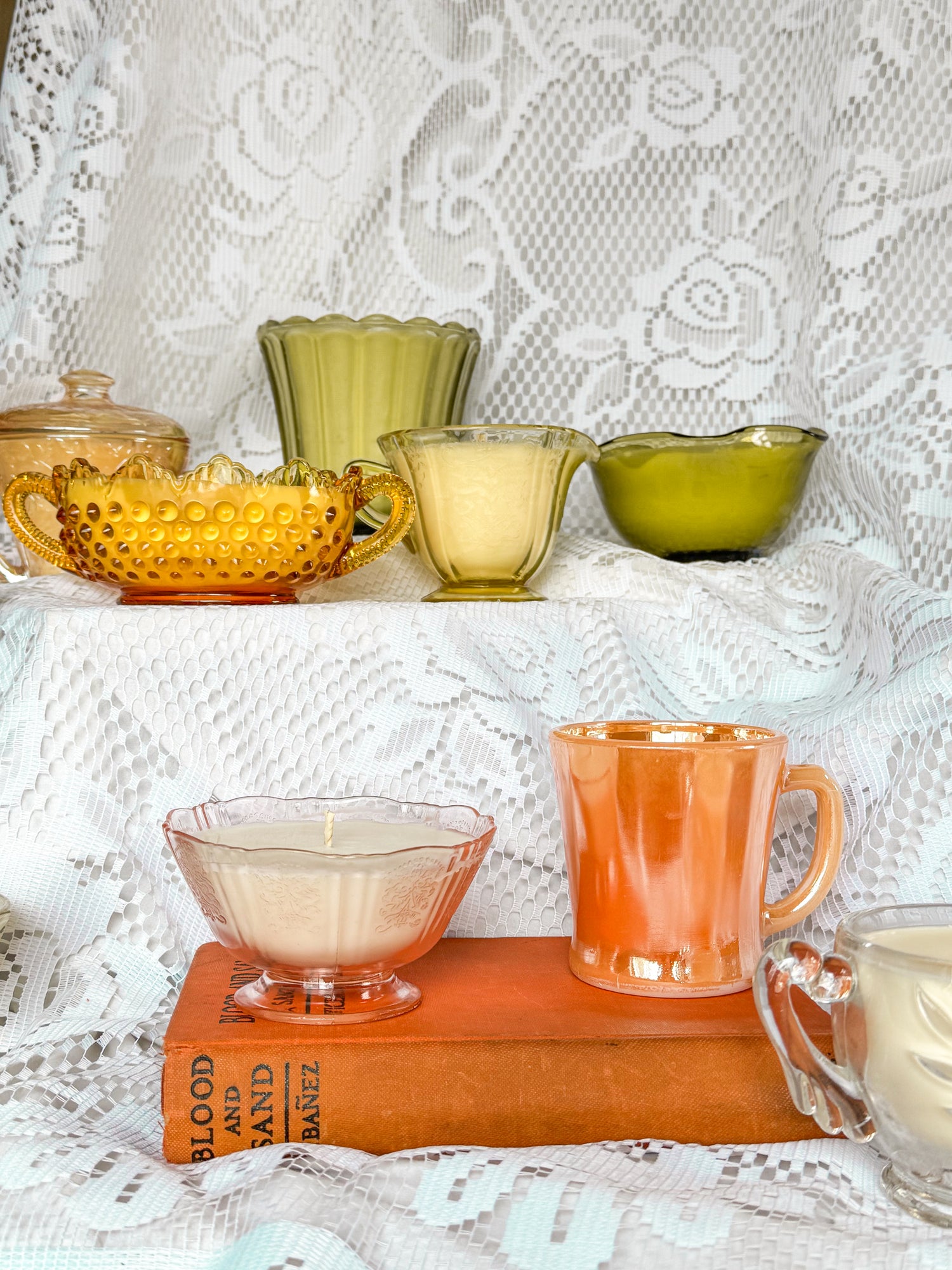 Vintage vessels are the forgotten glassware in your grandmas china cabinet. We like to rescue them from the thrift store shelf or the auctions to give them a second life and appeal to the younger generations. Our candles are not only a functional décor piece, they are filled with history and also being saved from the landfill one vessel at a time.